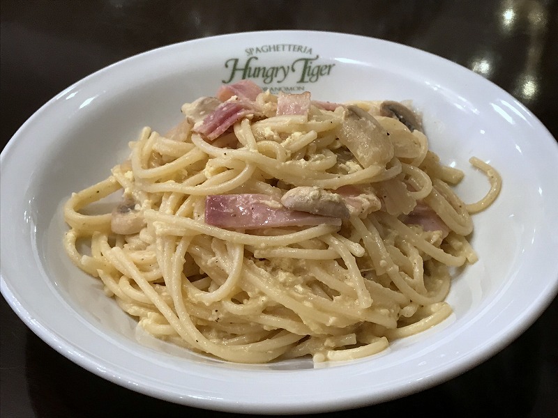 パスタと一緒にハムやベーコン玉葱が口の中でコラボします。