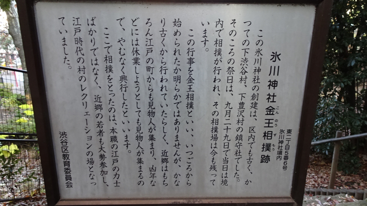 國學院大學の西側にある氷川神社の境内、氷川の杜公園の側に解説板があります。これのためにわざわざ来る人はいないでしょうが、氷川神社のお参りのセットであれば見どころが増えて得した気にもなります。都心ながら木々がうっそうとしていました。