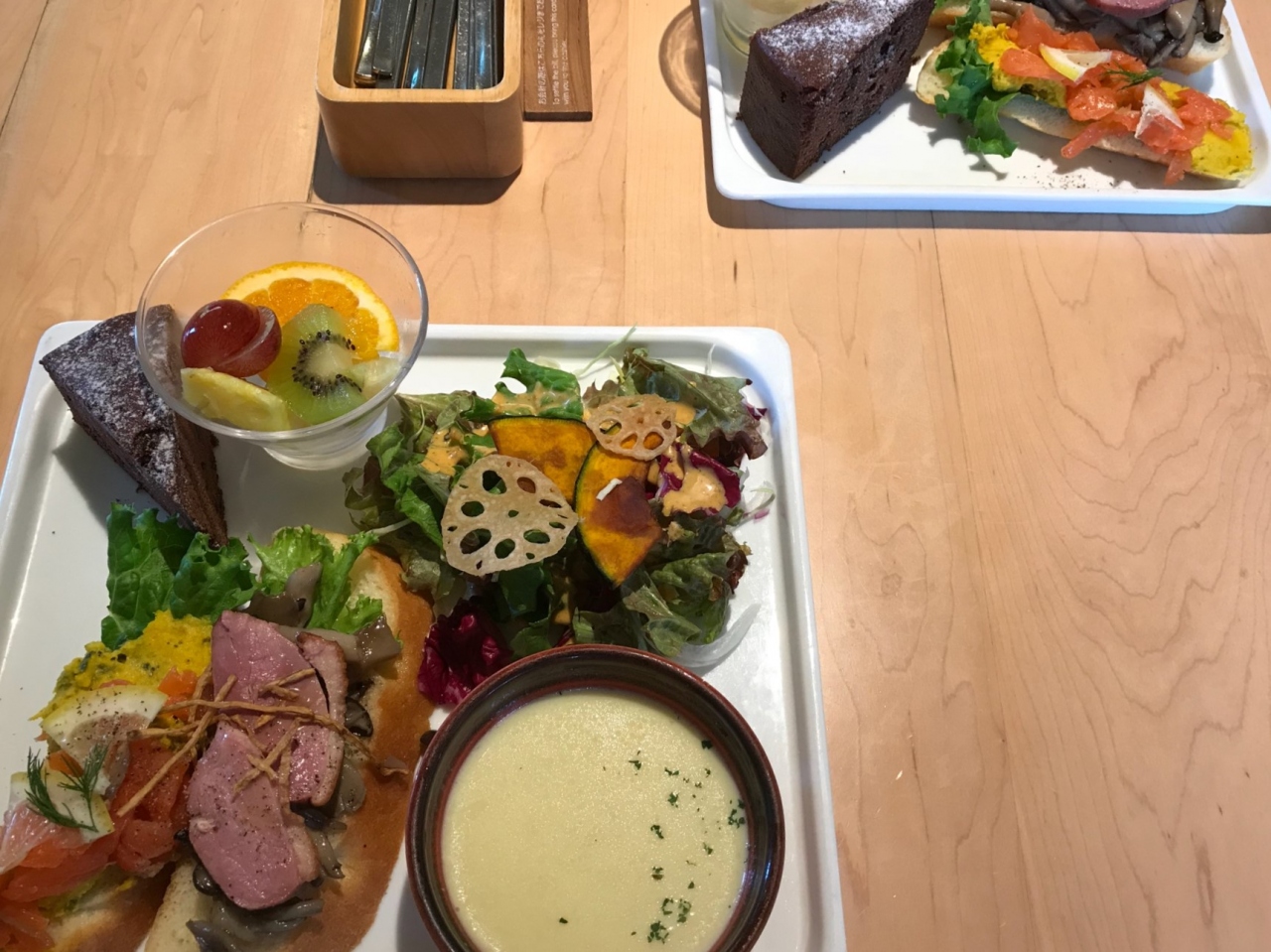 ワンプレートにサラダ、スープ、オープンサンド。更にケーキとフルーツが載っていて、かなり食べ応えがありました。