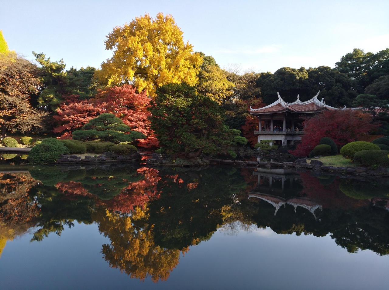 御苑内の案内板には台湾閣と書かれている場所です。中華風の建物がとても綺麗で雰囲気があります。御苑に行くと誰でも立ち寄る場所ではないでしょうか。建物の周りの紅葉がとても綺麗でした。池の反対側から見る景色も綺麗でしたが、中から見える紅葉も美しかったです。