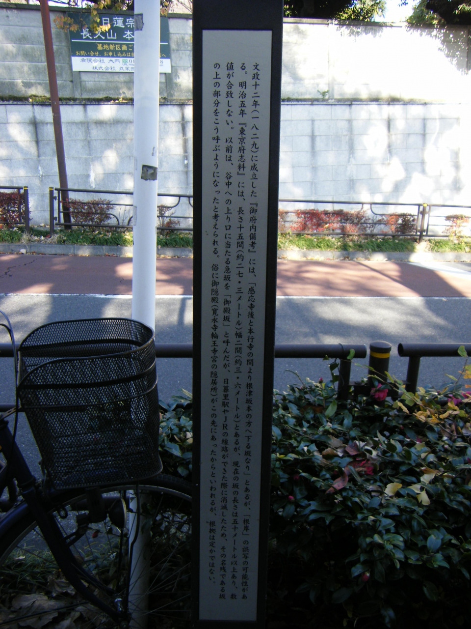 2017年12月の休日に訪問。JR日暮里駅北口改札を出て、すぐ目の前の通りを左手に曲がるとすぐに上り坂にさしかかりますが、ここが御殿坂と呼ばれる坂になります。坂としてはとても短く、せいぜい100mほどの坂ですが、周辺にはたくさんの寺院があり、またこの御殿坂をまっすぐ進むと谷中銀座に辿り着けることから人通りは多かったです。かつてはこの坂の先に「御殿隠」があったことからこの名前が付けられたそうですが、定かではないそうです。わざわざこの坂を見に来る価値はあまり感じませんでしたが、周辺には観光地がたくさんあって、そのついでに通るならいいかもしれません。