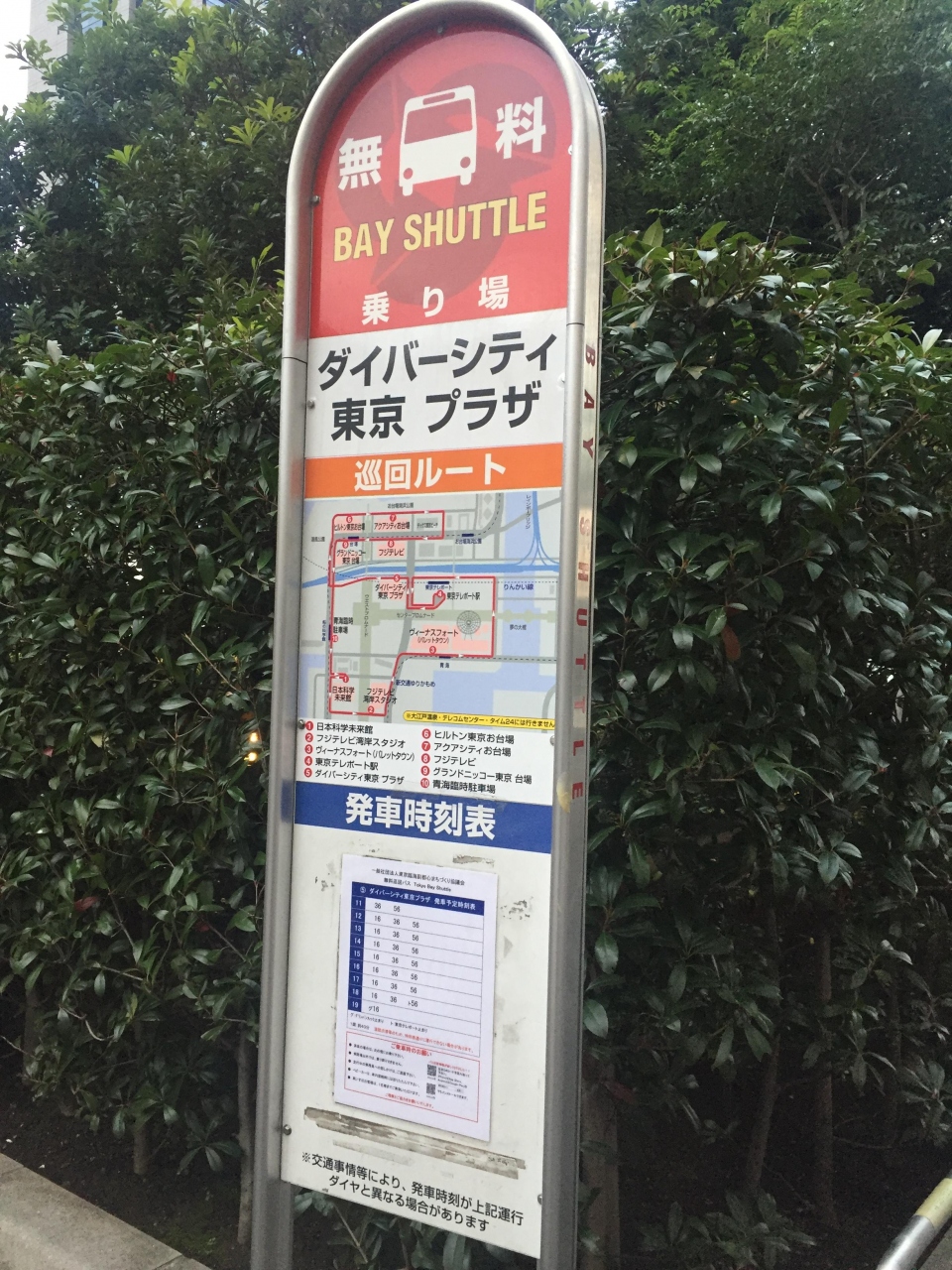 お台場地区には、いろいろなスポットや商業施設が点在しています。が、歩くとなると、ちょっと面倒って時も。そんな時に便利なのが、このベイシャトルです。各主要スポットを巡回していて、しかも無料です。ただ運行している時間帯が短いのと、本数はあまり多くありません。また巡回ルートを確認しておかないと、思いの外時間がかかってしまったり、歩いたほうが早かったりなんて事もありますので。