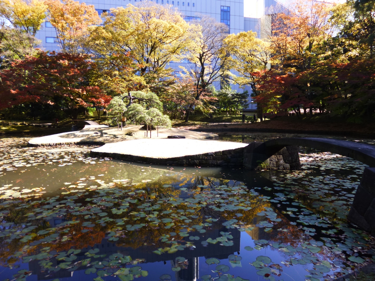 現在は、閉鎖されていますが、正門であった東門のすぐ裏手がこの、内庭になります。入場門から、正反対の場所になるので、奥まった場所のようにも感じますが、本来は、こちらが、表となる場所です。ここには、水戸藩主の書院が造られていて、唐門を通って、後園の現在の後楽園へ、抜けるようになっていたようです。現在は、唐門跡付近が工事中でフェンスがあったりして、景観は少し損なわれていますが、池に架かる反り橋の姿は、趣があります。