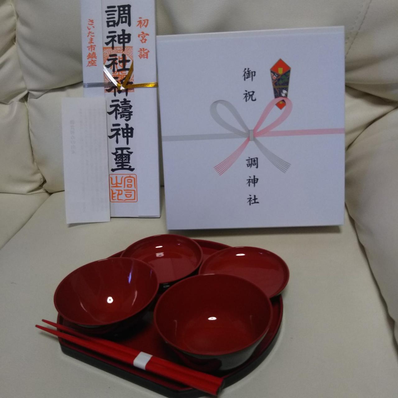 浦和にある調神社に子供のお宮参りで行きました。12月でしたが、七五三組が6組くらいいて御祈祷もみんな一緒でした。名前はそれぞれ呼ばれます。お宮参りの記念品はお札にお食い初めの食器でした。七五三だとマグカップがつきます。