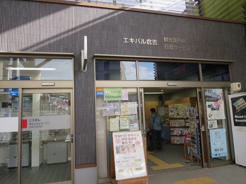 倉吉駅の観光案内所です。予定外に倉吉で見学時間ができたので、観光の見所を聞きました。バスでどのように行けば良いかを教えていただき、地図をもらいました。バスに乗って、お勧めの白壁土蔵群まで迷わずに行くことができました。