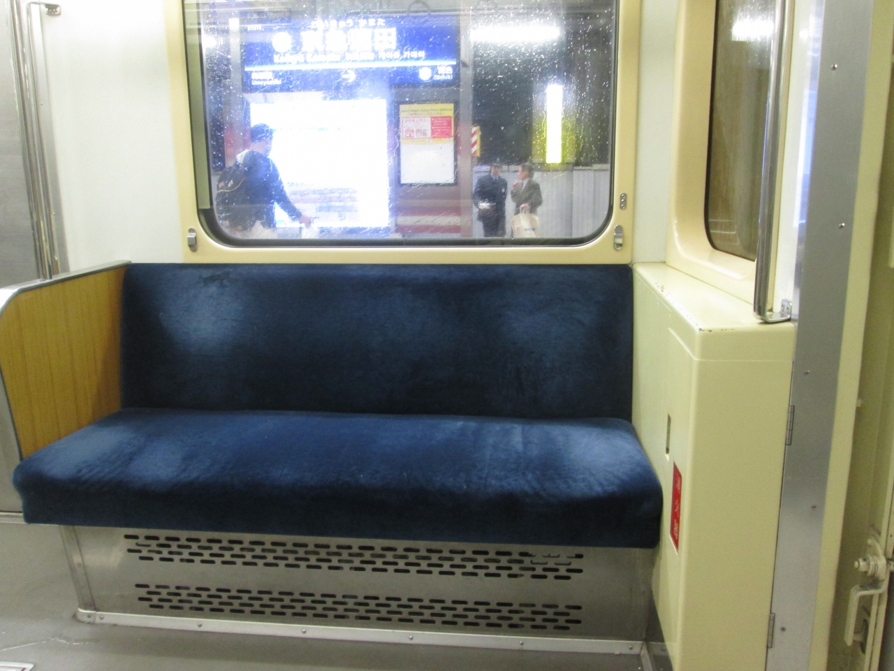 夜の遅い時間帯になると運行本数が減り、京急本線 (空港線)は普通電車となりました。ちょうど台風が接近している夜で、利用客がほとんどいませんでした。乗車した車両が昭和の頃から活躍していたような古いシートで、懐かしさを感じながら移動しました。