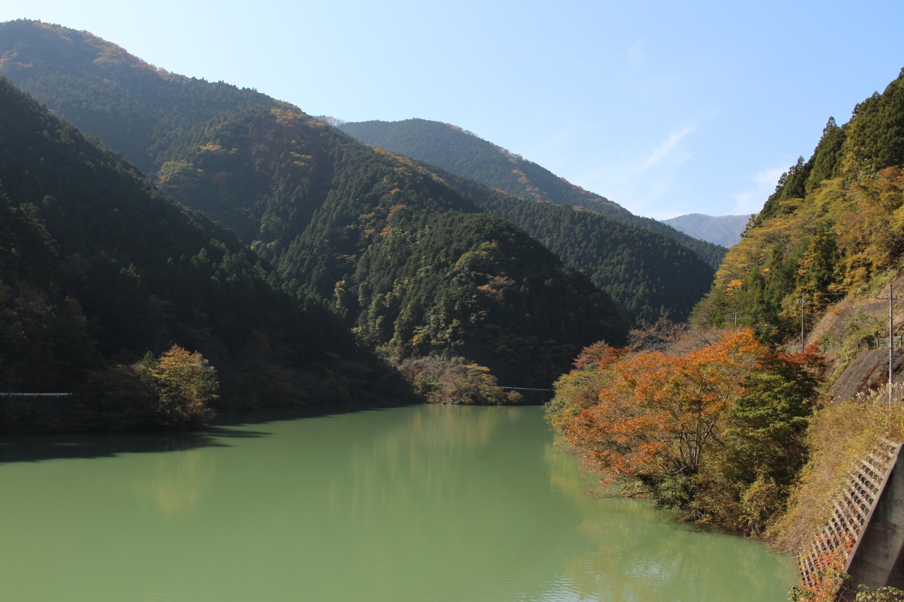 湖を車で一周しましたが、有間渓谷を登っていかないと、紅葉はわずかしか見えないかもしれないです。