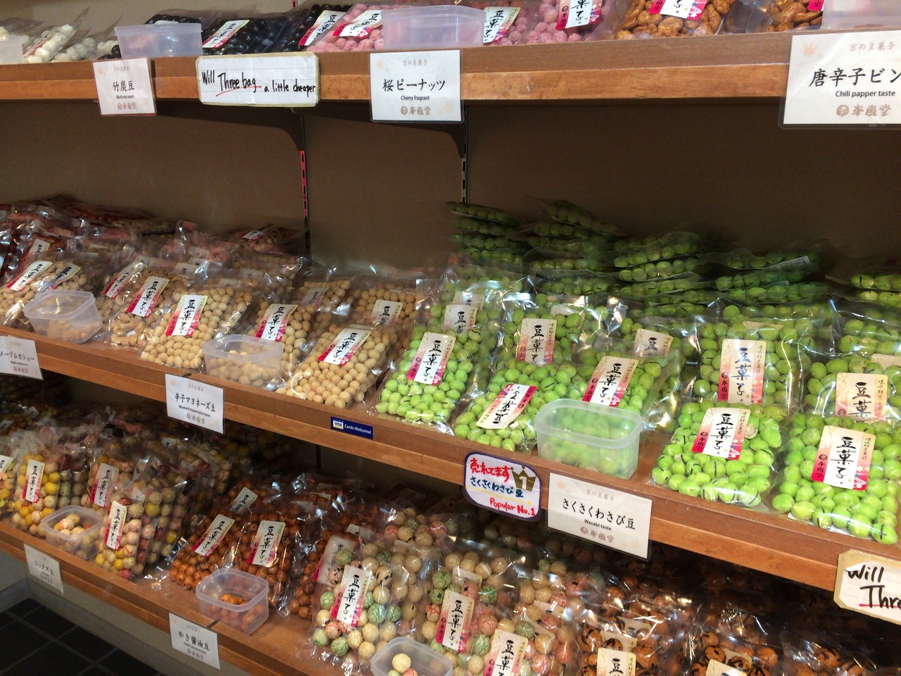店内には、色んな豆菓子が売っていて、どれも試食ができるので、好みの味を選べたのが良かったです!カレー味のカレー豆が私好みでした。