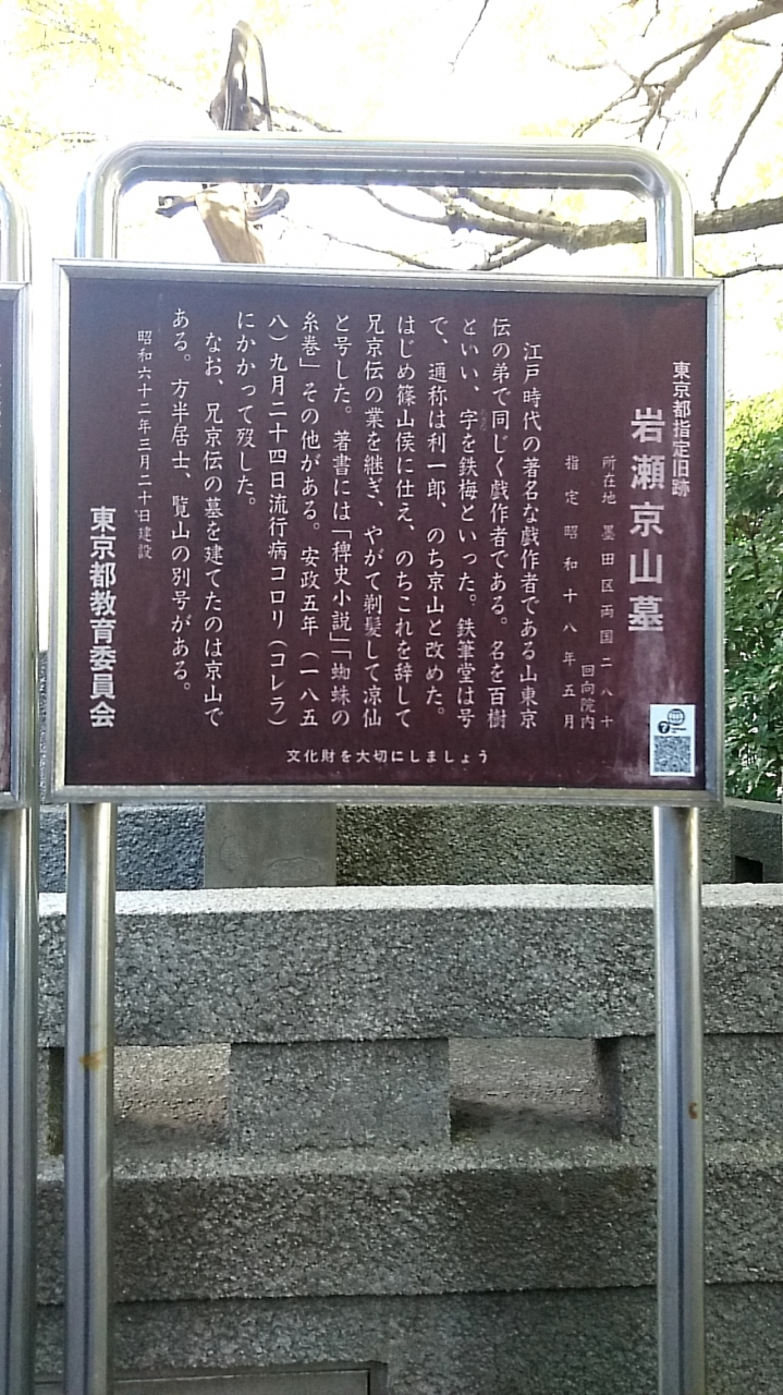 回向院には、岩瀬京伝とともに弟の岩瀬京山の墓もありました。こちらも初めて聞く名前ですが、岩瀬京伝と同じく戯作者です。兄・京伝は晩年読本作家として活躍していましたが、京山も兄の業を継いで読本作家となりました。江戸時代の偉人かもしれませんが、今一つ想像できませんでした。