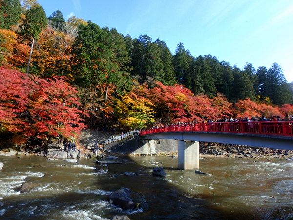 でもカラフルな紅葉、清流、青い空に赤い橋が映えてとてもきれい。