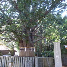 大鳥居をくぐって参道を進むと、左手に大きな御神木がありました。昔から熊野権現の象徴として信仰されて、旅の安全を願ってこの葉を懐に入れて参拝したそうです。見上げると、その大きくて立派な姿に、歴史を感じました。実で作られたナギ人形がありました