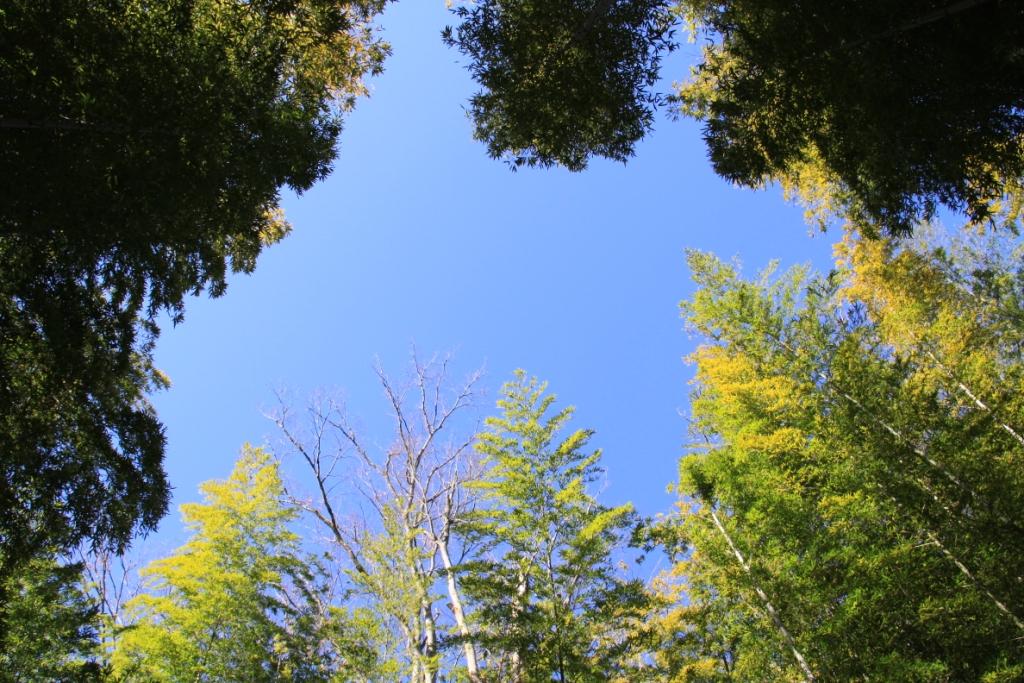 このベンチに寝転んで上を見上げると、竹林の緑の向こうに、青空が見えます。