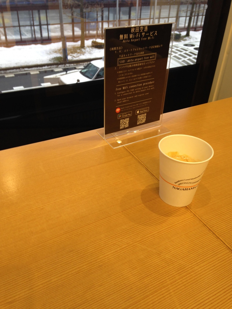 ナガハマコーヒーがあると口コミで読んでいってみました。一杯ずつ豆もひくので時間がかかります、もともとコーヒーに詳しくなく味の違いはよくわかりませんでした。。コンパクトな空港なのでお土産屋さんのすぐ前、搭乗口の斜め前に位置していて利用しやすかったです。トイレがあると思ったら電話コーナーでトイレはなかったです。