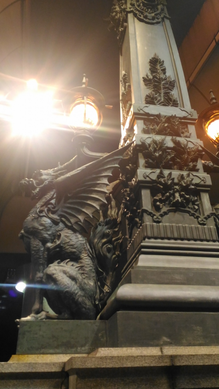 あまりいに幅広で橋のイメージの少ない日本橋ですが、いつもは足早に歩いて渡っていたために気づきませんでしたが、中央部に立派な麒麟の銅像がついていました。力強く造形された翼が印象的で、凛々しいというか力強いものを感じました。