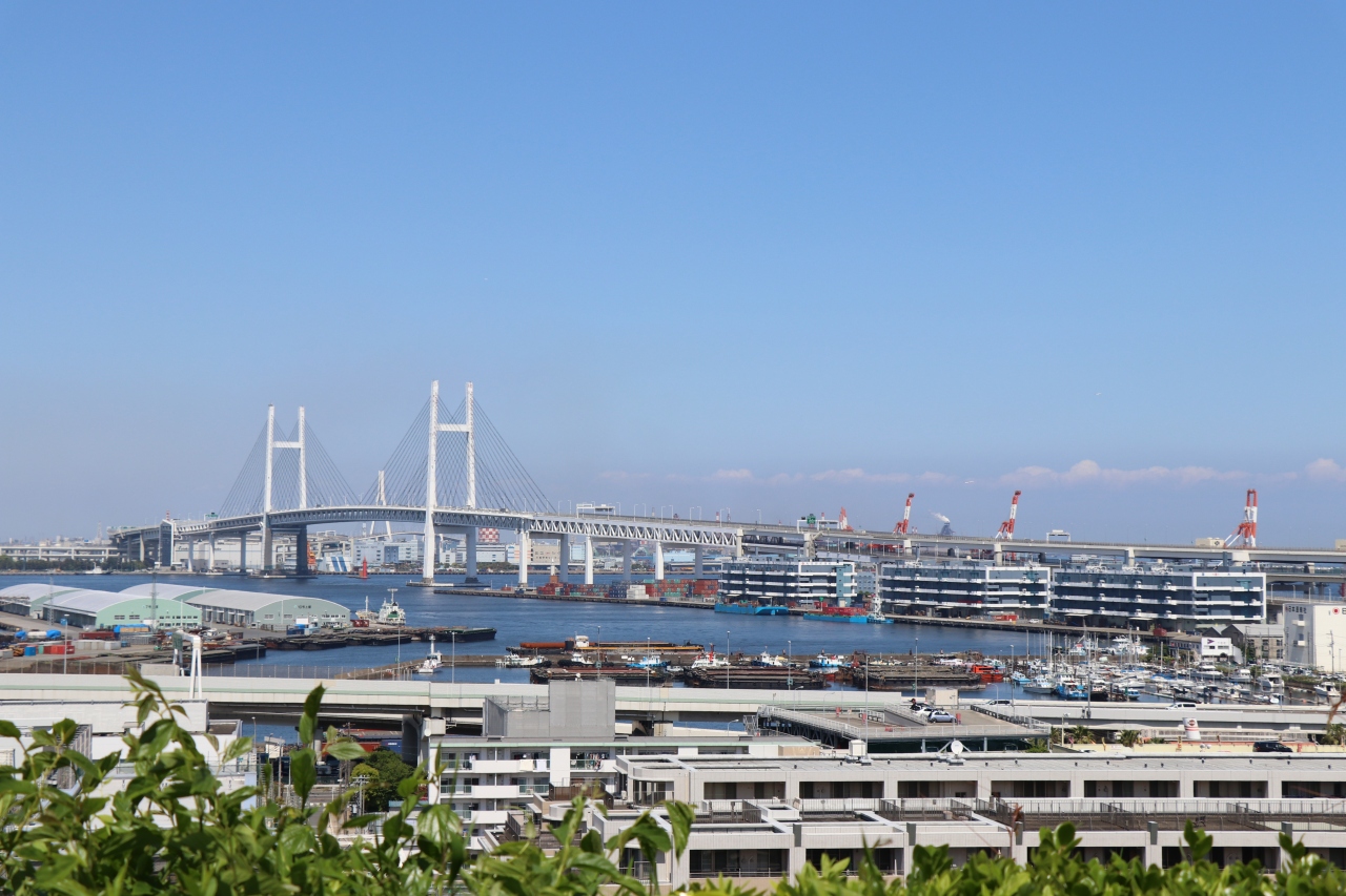 ローズガーデン隣になる展望エリア。ベイブリッジやマリンタワー以外にも港湾エリアを眺めることができます。椅子もあり、景色を眺めながらゆっくり過ごすことができます。丘の上にあるので起伏があり、中華街方面へは階段を降りて向かう形になります。