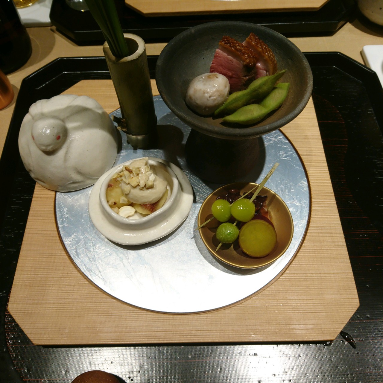今回は、個室にて利用いたしました。まず始めは出汁を飲むところからスタートとします。前菜から始まり、素材の良さに加え盛りつけも素晴らしくとても美味しかったです。オリジナルのさつま揚げは出来立ても手でもっていただけるなど、1品1品がとても楽しめます。