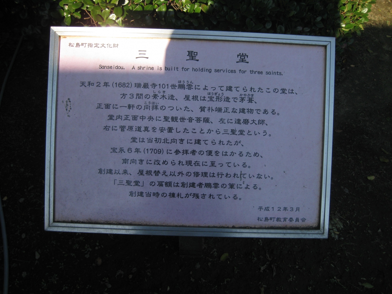 円通院山門前にある茅葺の小さな御堂。天和2年(1682年)瑞巌寺第101世鵬雲東摸によって創建、名前の由来は正面に観世音菩薩、左に達磨大師、右に菅原道真公を祀っていることに寄ります。この観音様は蜂谷観音として地元で信仰され、観音堂の前にはその蜂谷とゆかりの瑞厳寺の尼となった紅蓮尼の”軒端の梅”がひっそりと立っています。観光客は少なく見過ごしそうですがその分ゆっくりと見学できます。