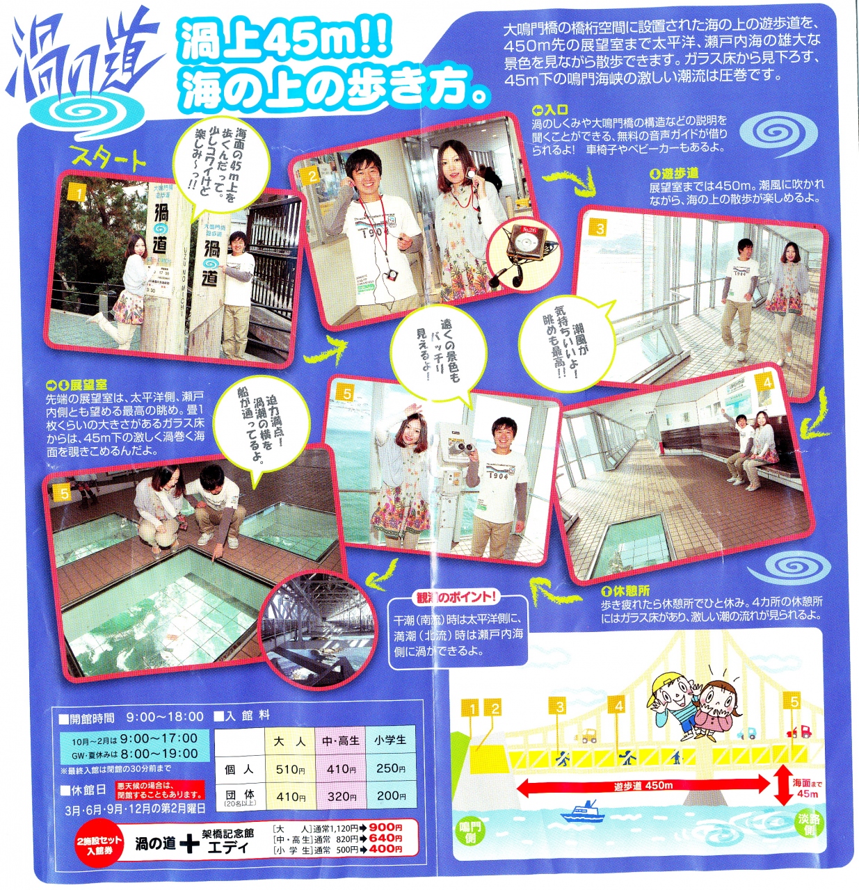 大鳴門橋の下の遊歩道 大鳴門橋架橋記念館エディの前を通ると割引券を売っているので買ってしまった.900円 ここからのうずしおもなかなか.若干高いところから足の下のガラス越しにも除くのでちょっとスリルがある.端までゆっくりで10分ほど.30分程度で見学できる.しかしもし時間がなければ遊覧船の方が迫力あっていい