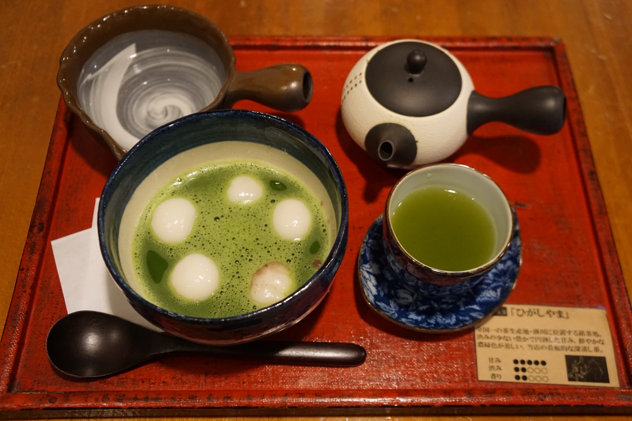 店内はこじんまりはしていますが、ほどよい広さの落ち着いた空間。そこに落ち着いて。さて、抹茶しるこの方は、なるほど、これはあり。抹茶の味わいもおしるこの味わいも両方成り立っていて、不思議なおいしさ。ご主人から静岡のお茶のあれこれも伺って、楽しい時間を過ごしました。アットホームなところもあるし、なかなかいいお店です。