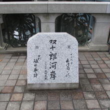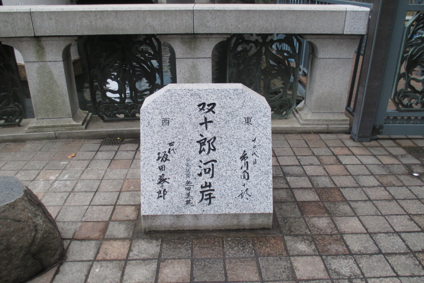 滝の広場の一画に置かれています。日本橋川を挟んで、日本橋の北詰めは魚市場があって魚河岸と呼ばれていましたが、この南詰めは何の変哲もない西河岸と呼ばれてきたそうです。そこで、2011年に現在の日本橋架橋100周年の記念事業として、双十郎河岸との命名を行ったとのことです。(歌舞伎の藤十郎と團十郎から名前を貰った)