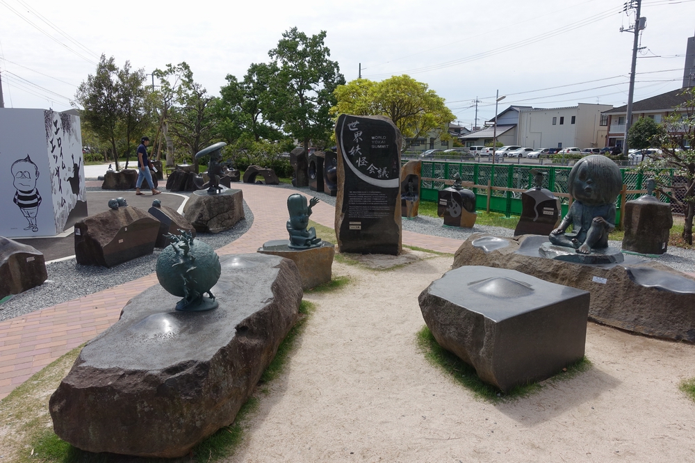 平成30年7月完成に向けて、すでにリニューアル工事が始まっています。一部の妖怪ブロンズ像は、工事のため境港駅前ロータリー南側の広場に「世界妖怪会議」と題して移設されていました。道路は一部コーンや柵が置かれ車道部分で通れなくなってる箇所があるものの、歩道部分は特に問題なく歩けました。本格的な工事はまだこれからって感じのようです。