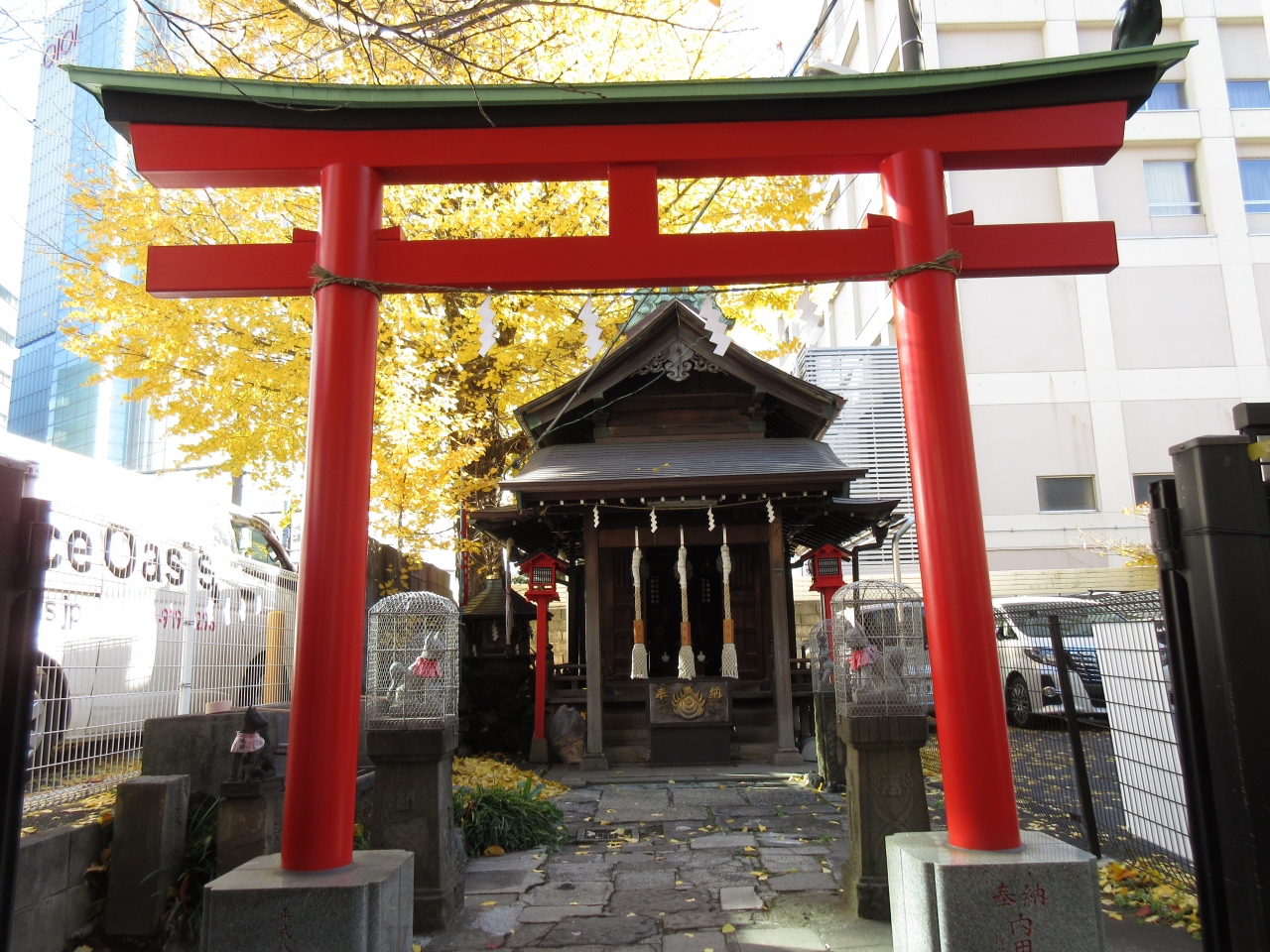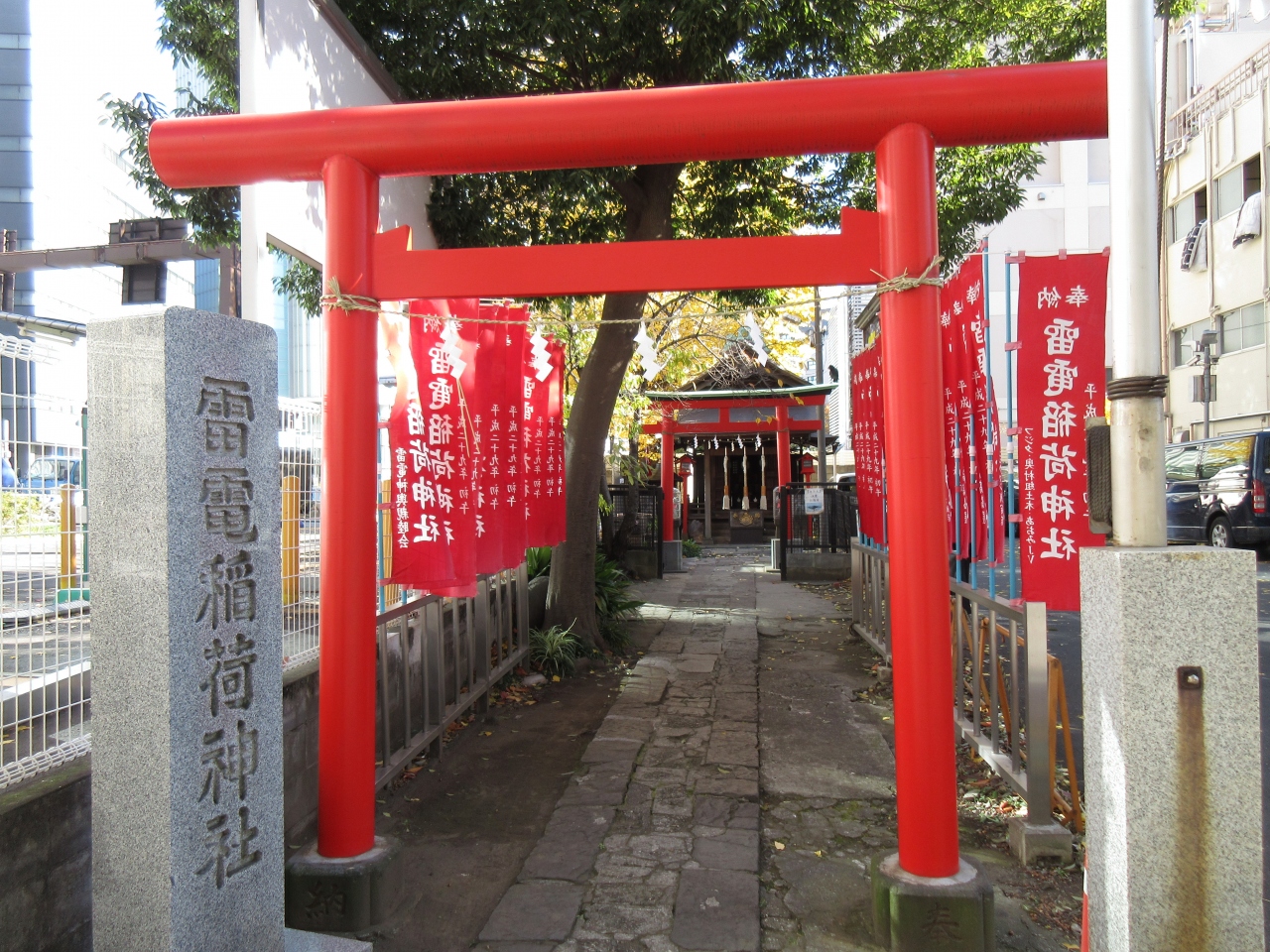 新宿高校の横にあるコインパーキングに挟まれた小さな雷電稲荷神社です。1928年に新宿5丁目の花園神社に合祀されるまでは、ここ新宿4丁目に雷電稲荷神社がありました。赤い鳥居と奉納された赤い幟が並び、篤く信仰されていることが分かります。小さな社殿の前にある2対のお稲荷さんに金網がかけられて保護されています。一羽のカラスが鳥居や社殿にとまってこちらを見ているのに気が付きました。境内に子育て期間中のカラスによる威嚇に注意の看板がありました。襲ってきそうで社殿に近づけませんでした。合祀されている花園神社へも行かれることをおすすめします。