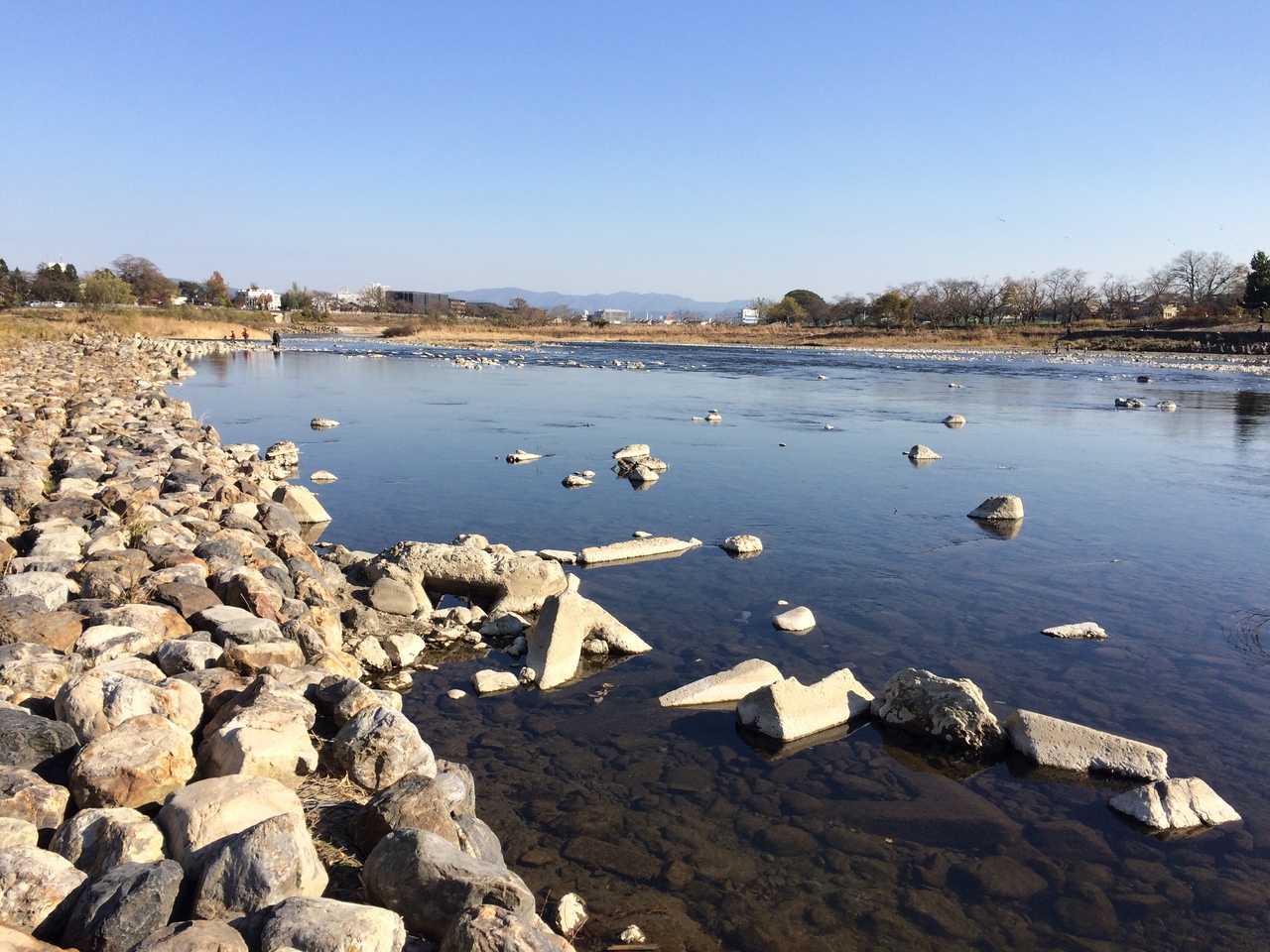 京都の嵐山に行ったときに、桂川のほとりで遊びました。とても穏やかな川で、流れなどもあまりない印象でした。川辺は、大きな石が敷き詰められているので歩きやすく、散歩するのにもいいです☆