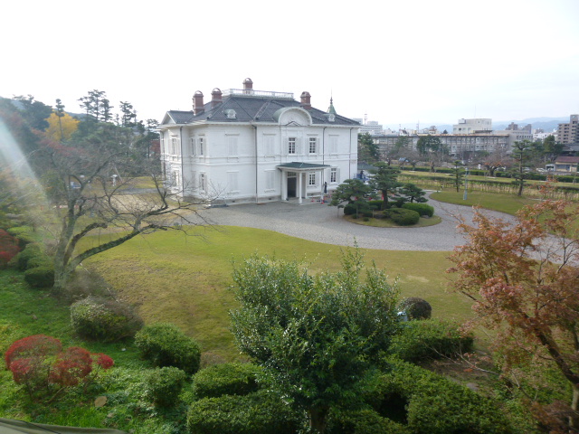 白亜の美しい洋館は国の重要文化財に指定されていて前庭に植えられた見事な松が植えられていました。館内は螺旋階段があり職人技の極みが随所見られ感動的。大正天皇が山陰行啓時の宿泊施設としてお泊りになられたそうです。