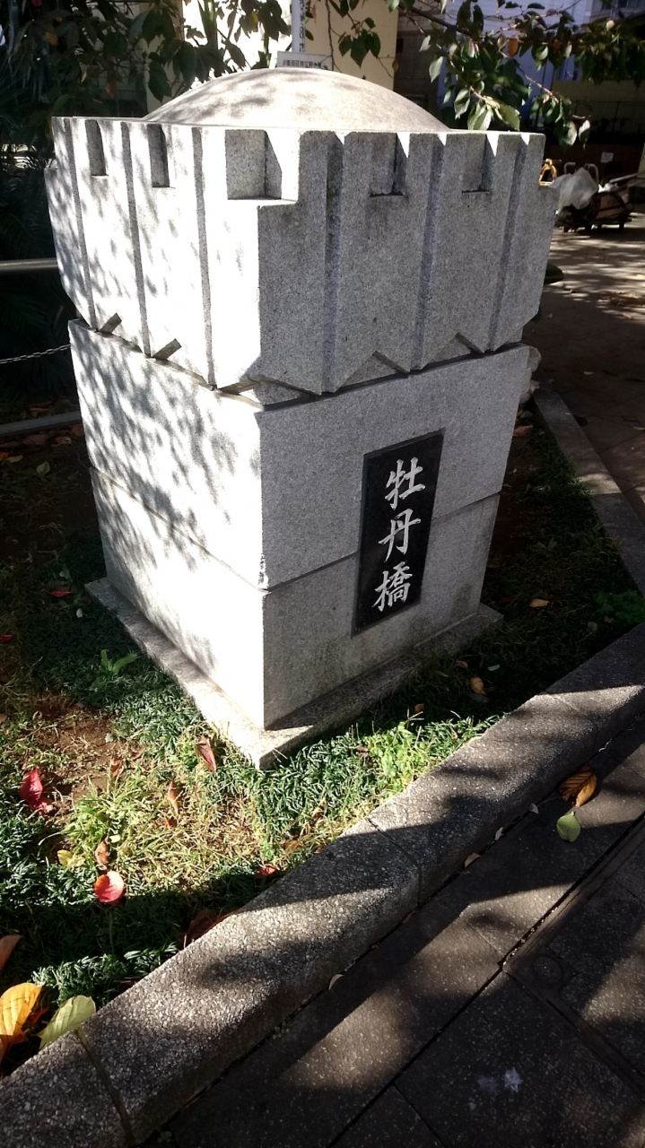 うす暗い高架下に川であった当時の名残として牡丹橋の親柱が残され、説明プレートが設置されています。当時橋の横に牡丹園があったことからこの名前になったそうですが、今の様子を見て過去の状況を思い起こすことはできませんでした。