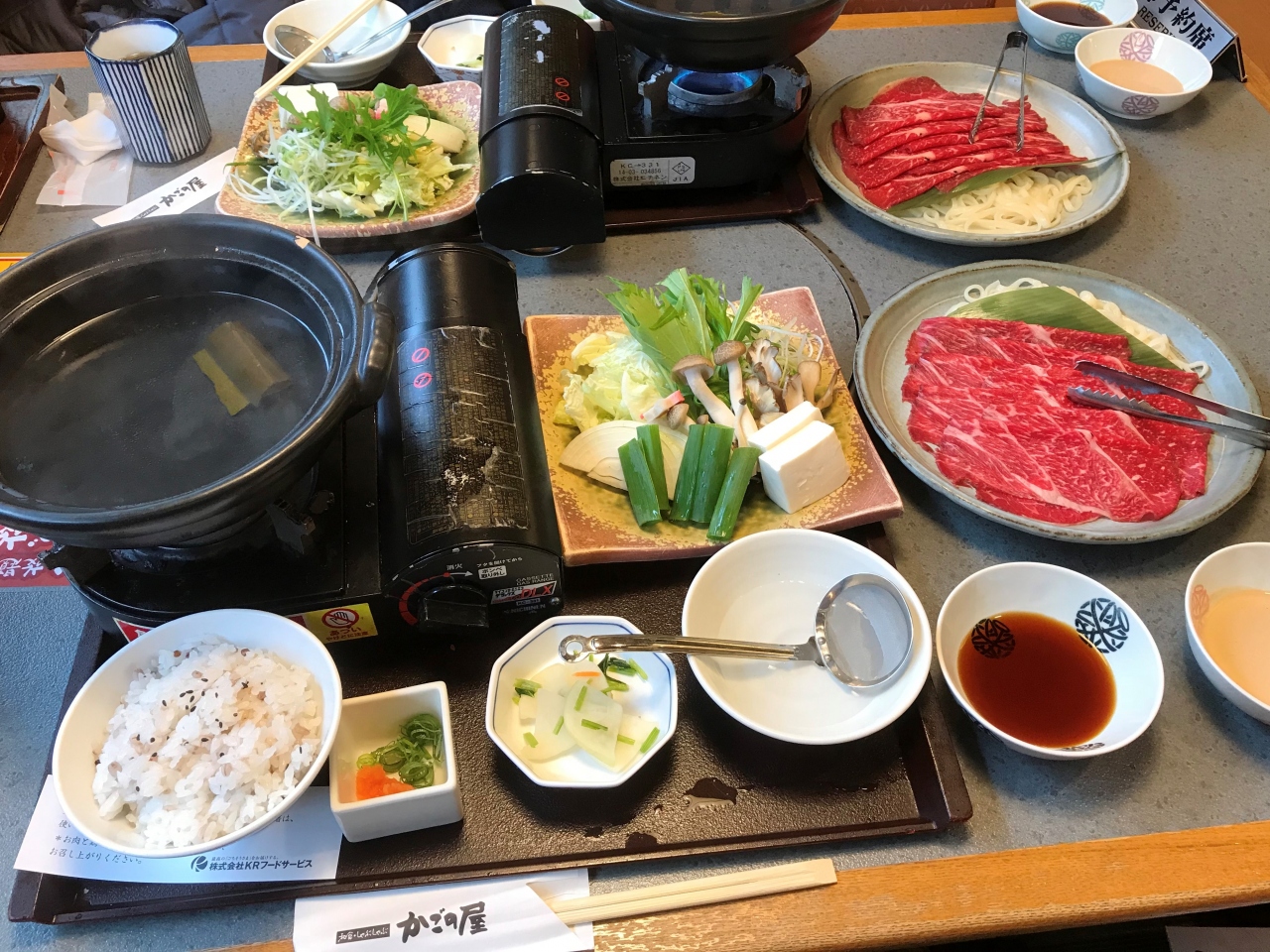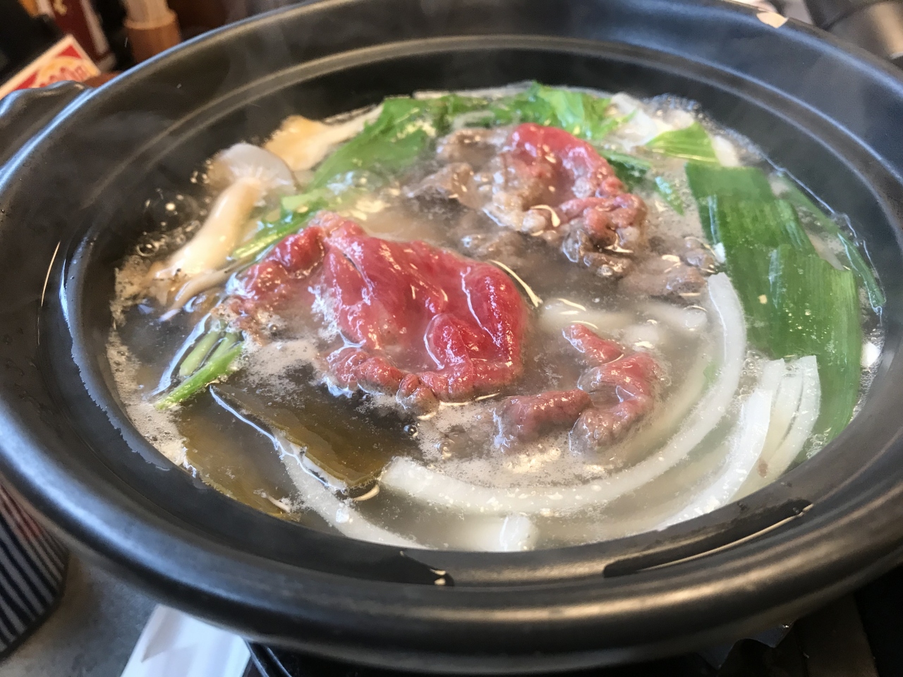 野菜がいろいろと黒毛和牛の薄切りが7枚くらい、うどんが少しついていました。