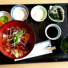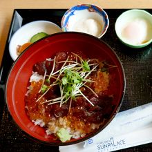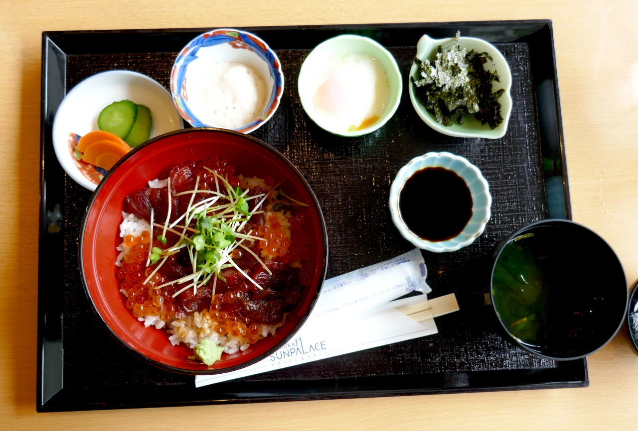 サンパレスのラグーンで.まぐろ漬け丼 いくらがのり,とろろ,卵付きで1230円税込とやすかった.このようなホテルや国際会議場の併設ではお勧めと思う.また翌日はパフェも食べた.喫茶としても使える.国際会議場の隣のホテルサンパレスの1階