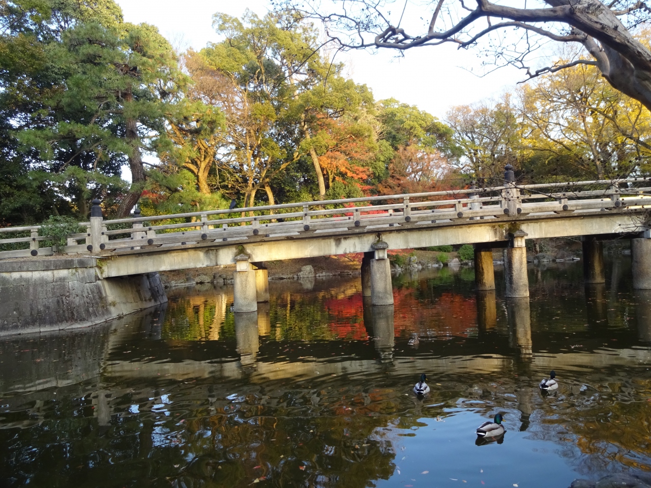 九条邸の跡地は池も残り、そこにかかる橋もあり、とても美しい紅葉も見られました。