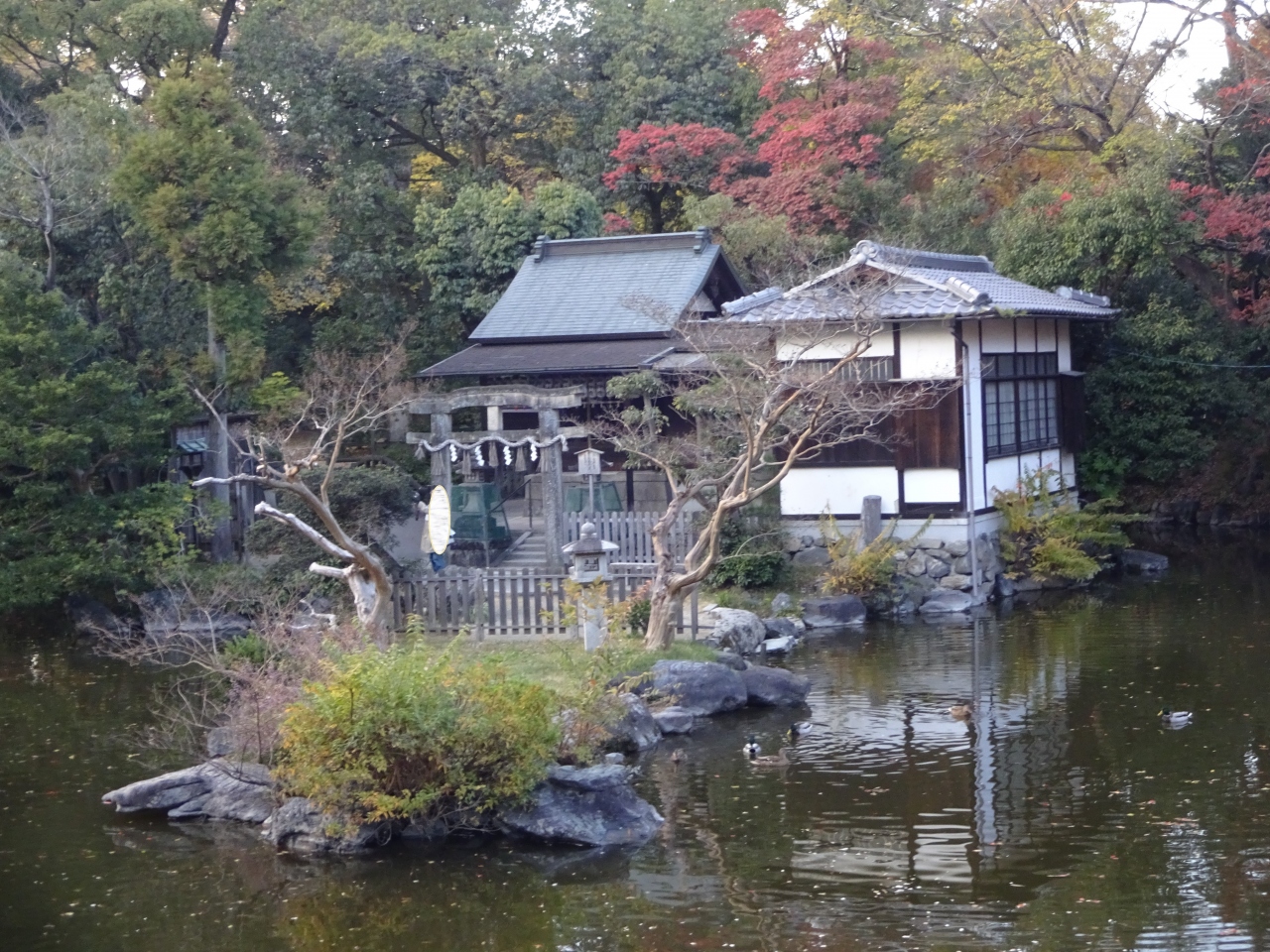 京都御苑の「間の町口」から入ると、すぐ近くの池(九条池)の畔にある小さな神社がこちら。
