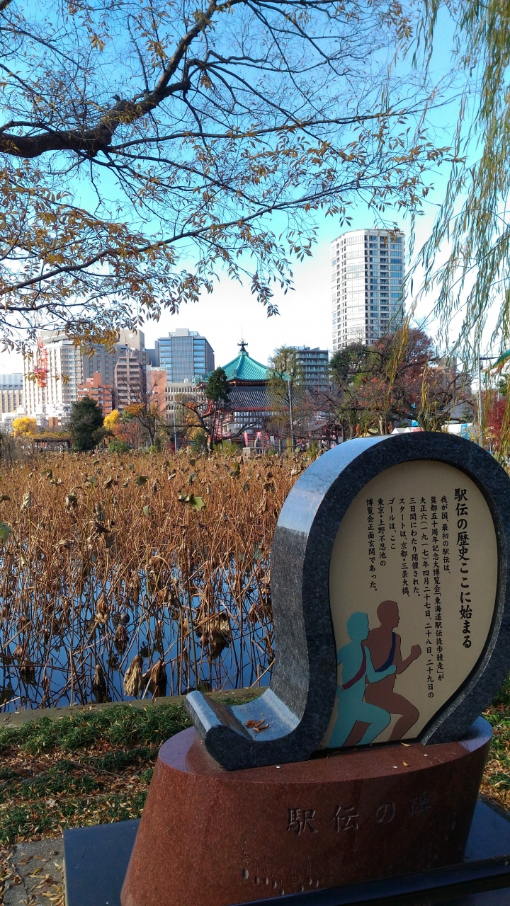 大正六年に初めて開催された駅伝大会のゴールがここ不忍池であったことを示す記念碑です。なんと、当時のスタート地点は京都の三条大橋だったとのことで、富士箱根駅伝をはるかに凌ぐ長距離だったようで、びっくりです。