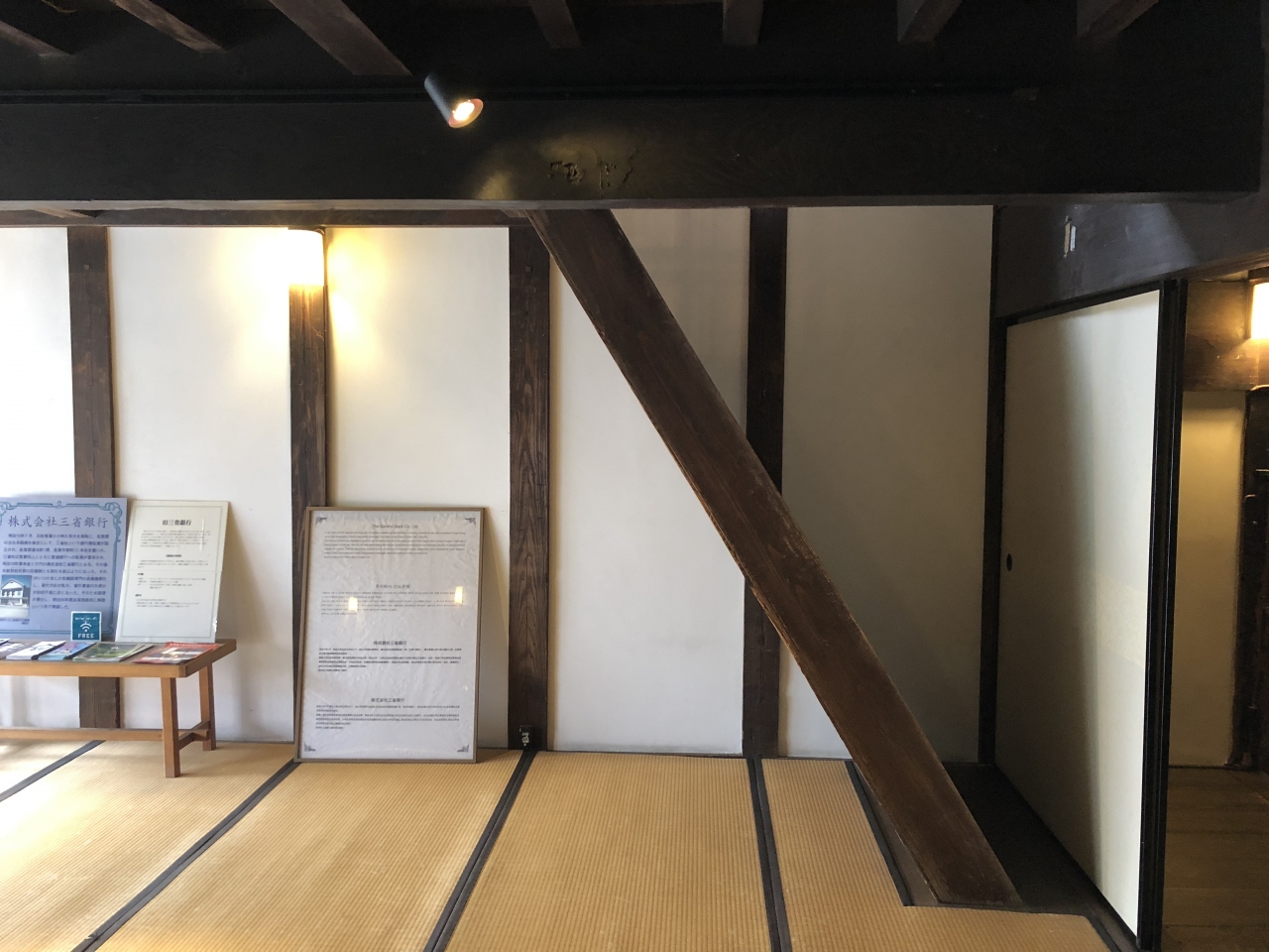 旧古賀家の隣にある日本建築は案内板を見るまで銀行とは気づかない。純日本風の家屋でさながら両替商のようだ。左右にある旧な階段は何のためであろうか。飛び降りるような70度近い傾斜のある階段だ。2階に上がるとなるほど銀行だと頷ける頭取のいた洋間がある。