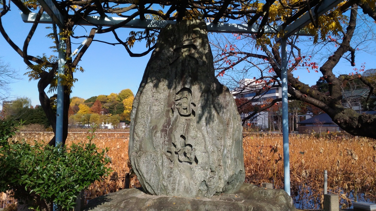 弁天島への道を進んでいったところ、右側の植物棚の下に立派な石碑がありました。不忍池という名前の由来は諸説あるようですが、かつて上野台地と本郷台地の間の地名が忍ヶ丘だったことに由来するというのがよく聞かれます。