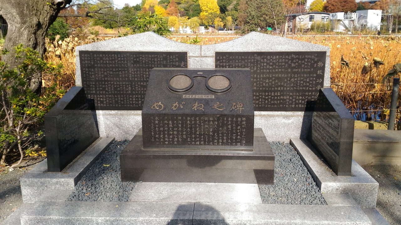 不忍池の弁天堂に向かう途中にありました。かわいい丸メガネでしたが、こちらは徳川家康公がかけていたものをかたどったものとのことです。東京の眼鏡業界の組合さんが、眼鏡の渡来と眼鏡の先駆者を供養する目的で建立したそうで、物故功労者の皆さんのお名前を刻まれていました。