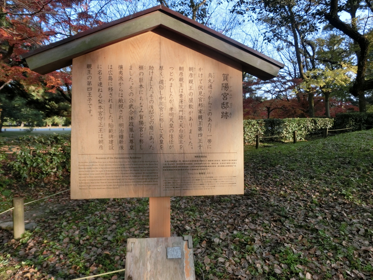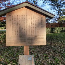 烏丸通り沿いの出水口から御苑に入り、白雲神社の南側原っぱの中ほどに木の案内板と石碑がある。