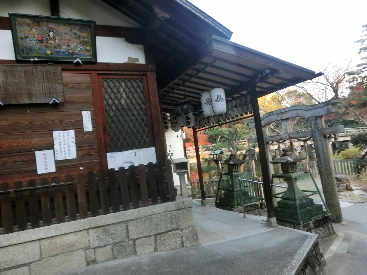 ここは丸太町通から堺町御門を入って左手、旧九條家の庭園跡の勾玉池(拾翠池、九条池ともいわれる)の島中にある。