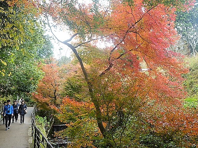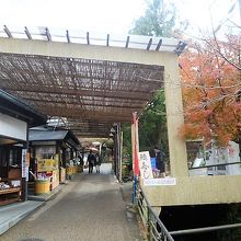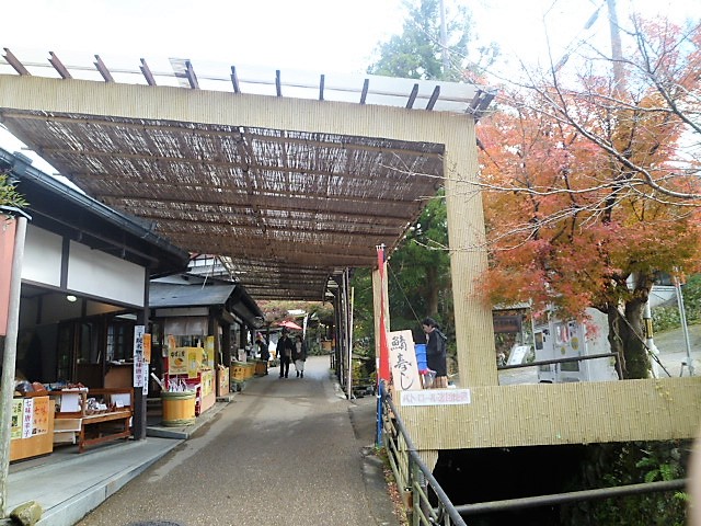 三千院に向かっている坂道が[大原女の小径]だそうです…もしかして`京都,大原,三千院の女`からでは、。途中はお土産店(漬物屋/ぽん酢)茶や茶店が並んでいました(TVでも放送されました)。三千院には紅葉を見に来たのですが、川沿いの小径;参道にぴったりの道/お土産店の前でも紅葉が (^o^)