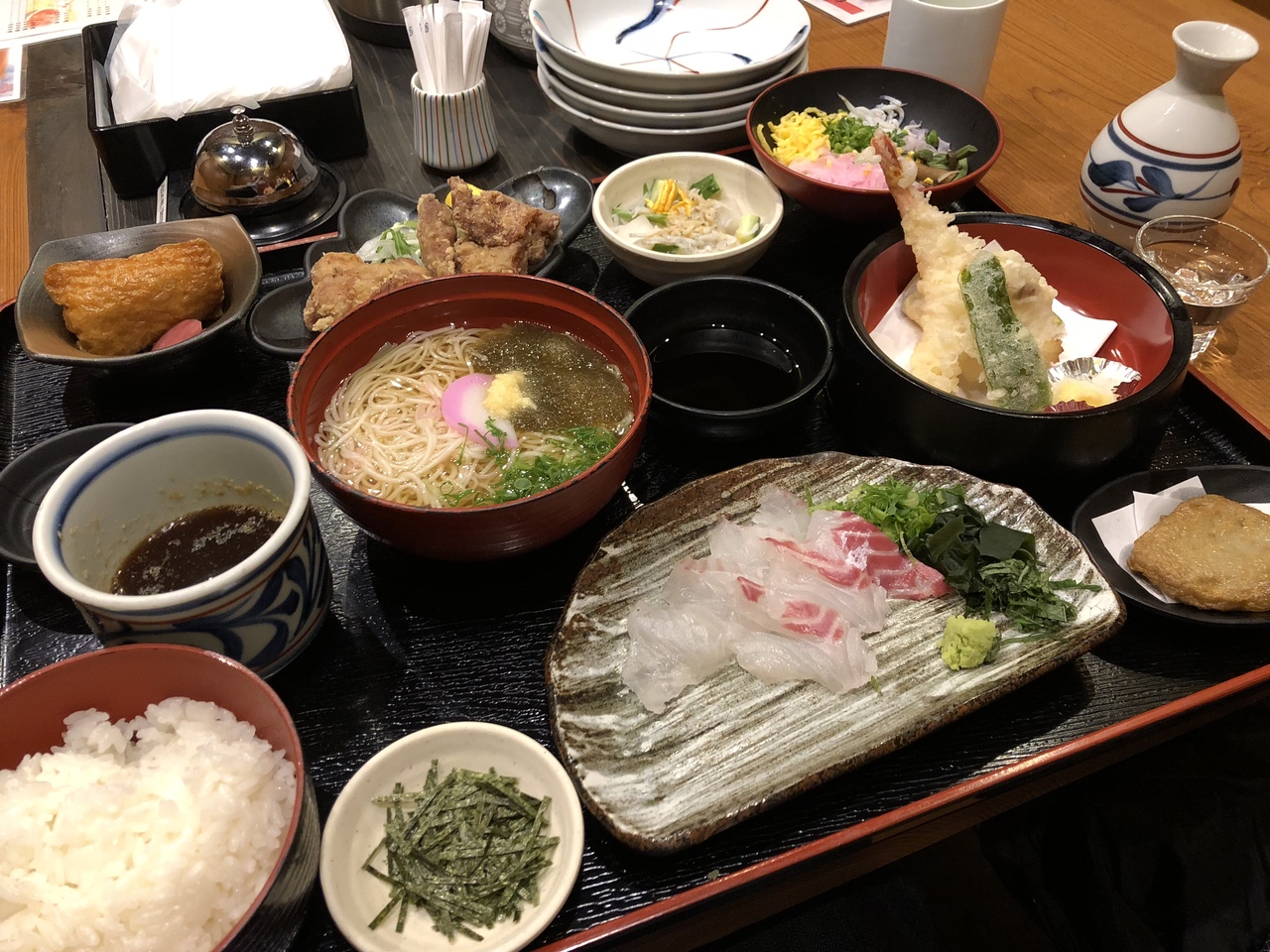 松山出身の友人に教わって訪れたお店で、地元で有名なお店のようです。ランチで2500円弱でそうめんとてんぷら、鯛めし、鶏のから揚げ、こんにゃくそうめん、蜜柑を使った稲荷ずしなどの料理が揃ったメニューをいただきました。いずれもおいしく、鯛めしは歯応えがよい鯛の刺身で言うことなしでした。地酒もいくつか取り揃えてありました。