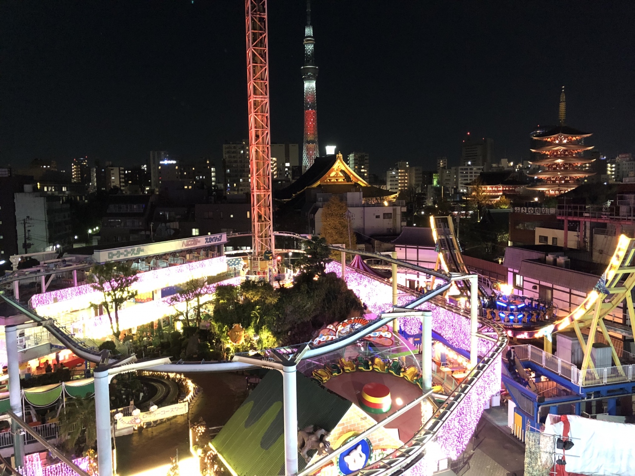 冬から春にかけて夜間営業の「ルミヤシキ」を開催しているということで行ってきました。花やしき自体久しぶり。園内はコンパクトですがイルミネーションが園内中輝いていてきれいでした。人も少なくてゆったり楽しめるのでおすすめです。