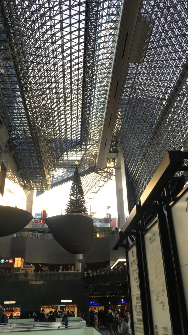 京都駅ビルは近代的な建物で、あまり京都のイメージとはあっていませんが、吹き抜けから見る景色はなかなかいいものです。クリスマス・シーズンになると、大きなクリスマスツリーができて、なかなかきれいな光景になります。昼はライトアップしていないのがむしろシックで京都のクリスマスと言った感じがします。