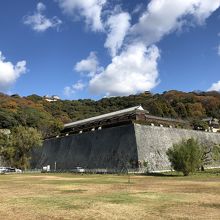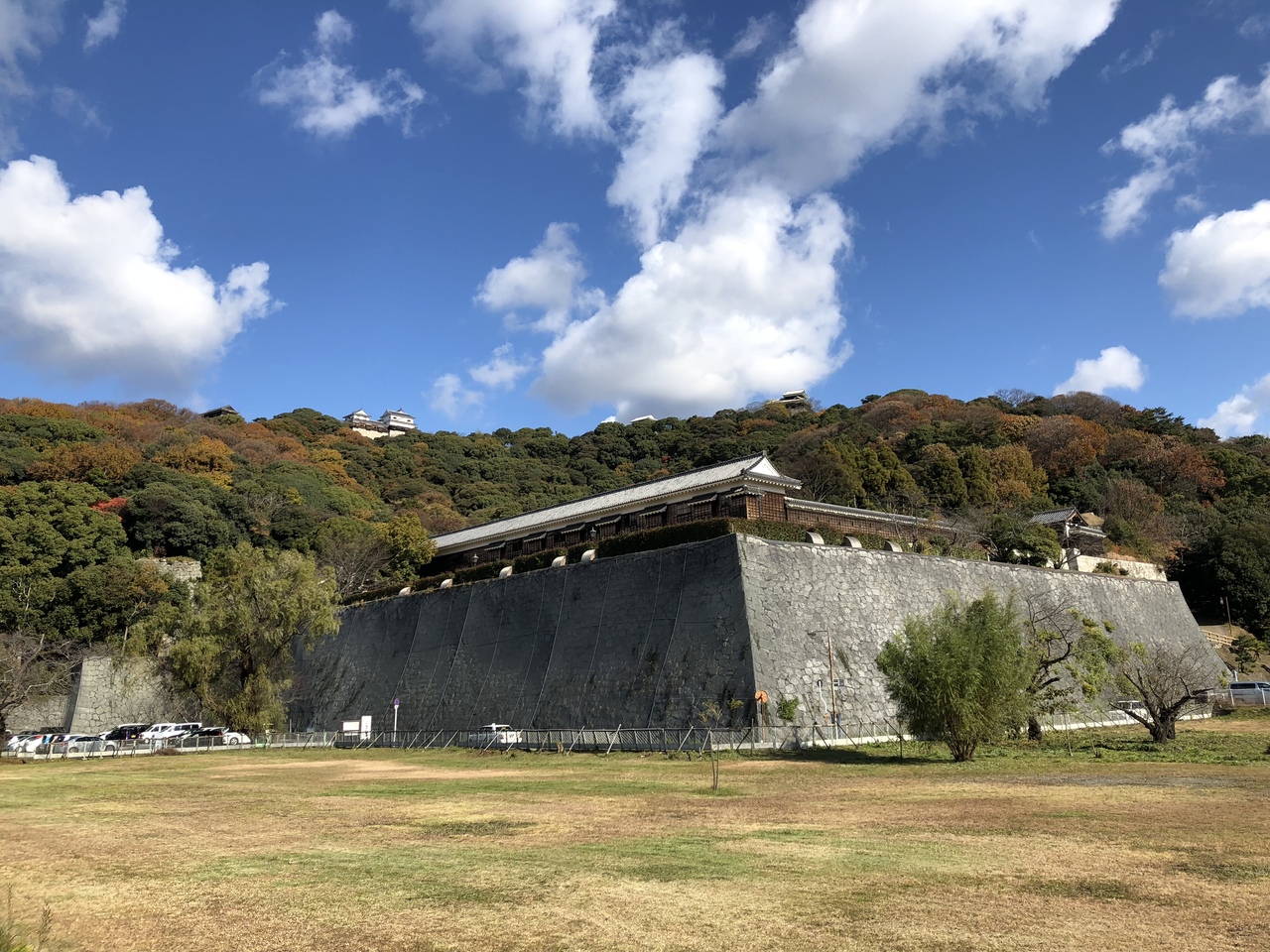 松山城は西半分が水堀に囲まれた正方形の形で、東半分は山を利用した計上になっています。東半分の山の頂上部にある本丸から一段降りたところにあるのが二之丸であり、結構な勾配の石垣の上に造られており、石垣の下から見上げると恰好がよかったです。