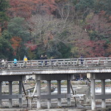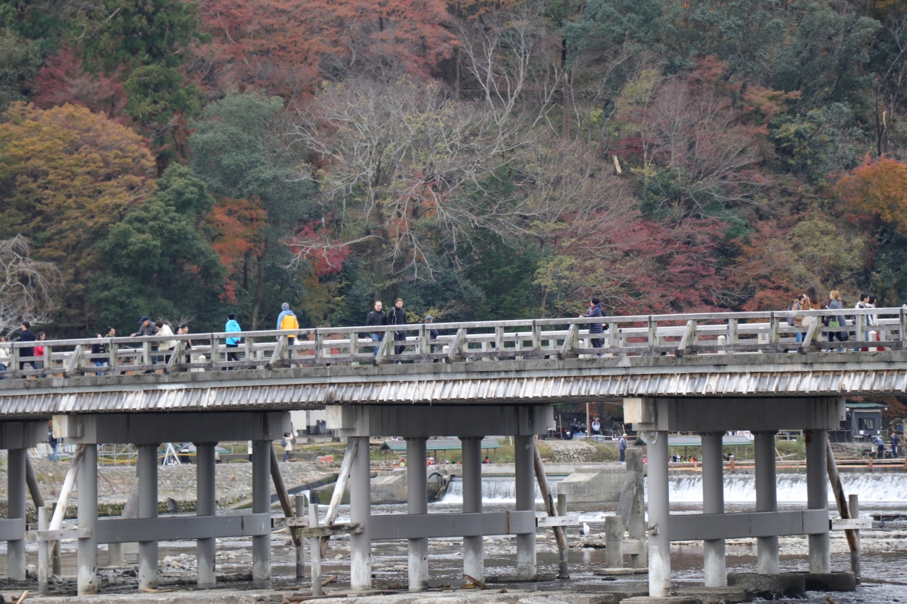 嵐山のシンボルともいえる建築物ですね。無料で行き来できますが、道路との併用橋なので車の通行にはかなりの注意が必要です。