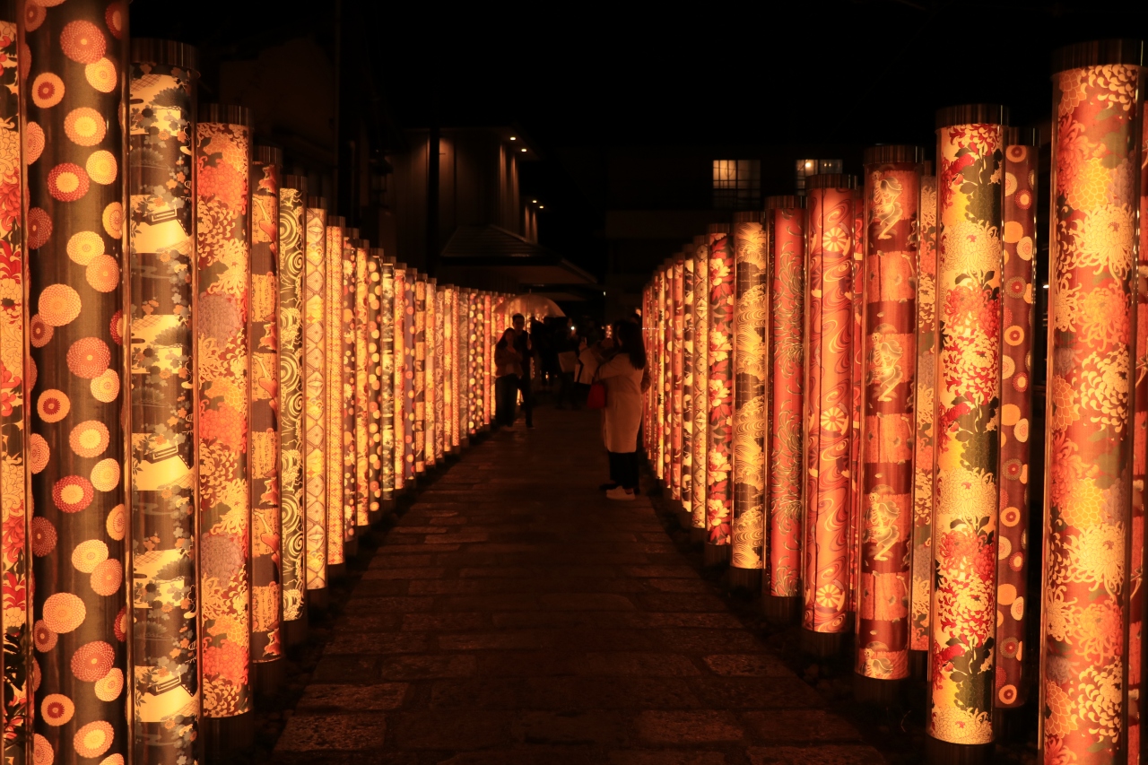 友禅のポールが京福電車の嵐山駅すぐ横にあり、夜間は光るようになる。それが先まで続いていると綺麗に見えました。他は足湯やショッピングモールになっており、簡単な飲食店やお土産屋さんが軒を構えている。ちょっとした時間待ちにはよい場所です。