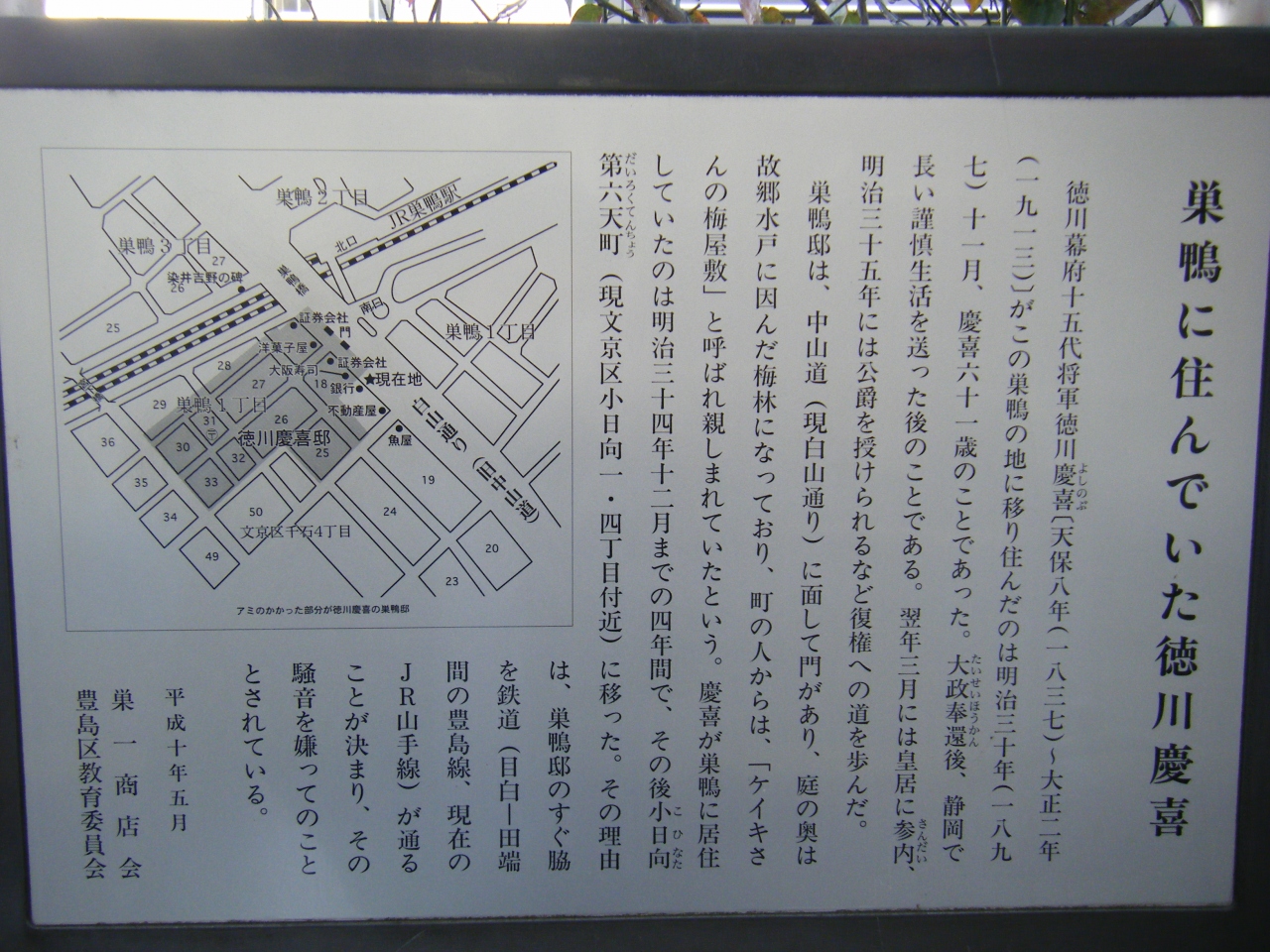 巣鴨駅から徒歩数分(1~2分)、白山通り沿いに南下すると右手に日高屋さんがありますが、そのすぐ目の前に石碑と案内板が立っています。徳川慶喜は大政奉還後、静岡で謹慎していたそうですが、その後61歳のときにここ巣鴨に移り住んだそうです。ただ、ここにいたのは4年ほどで、この邸宅のすぐそばを鉄道が通る事になったのを受けて、騒音を嫌ってすぐに引っ越してしまったそうです。当時からそういった問題があったというのはちょっと面白かったです。