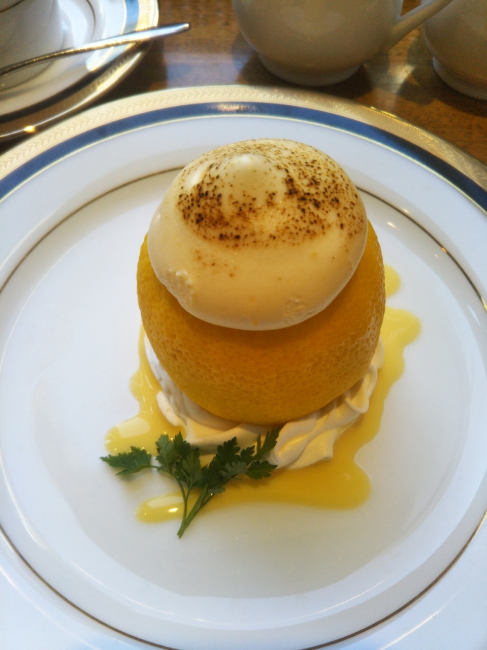 中身をくり抜いたレモンの中にはレモンムースがたっぷり。お好みでレモンシロップを足すと苦味が和らぎます。