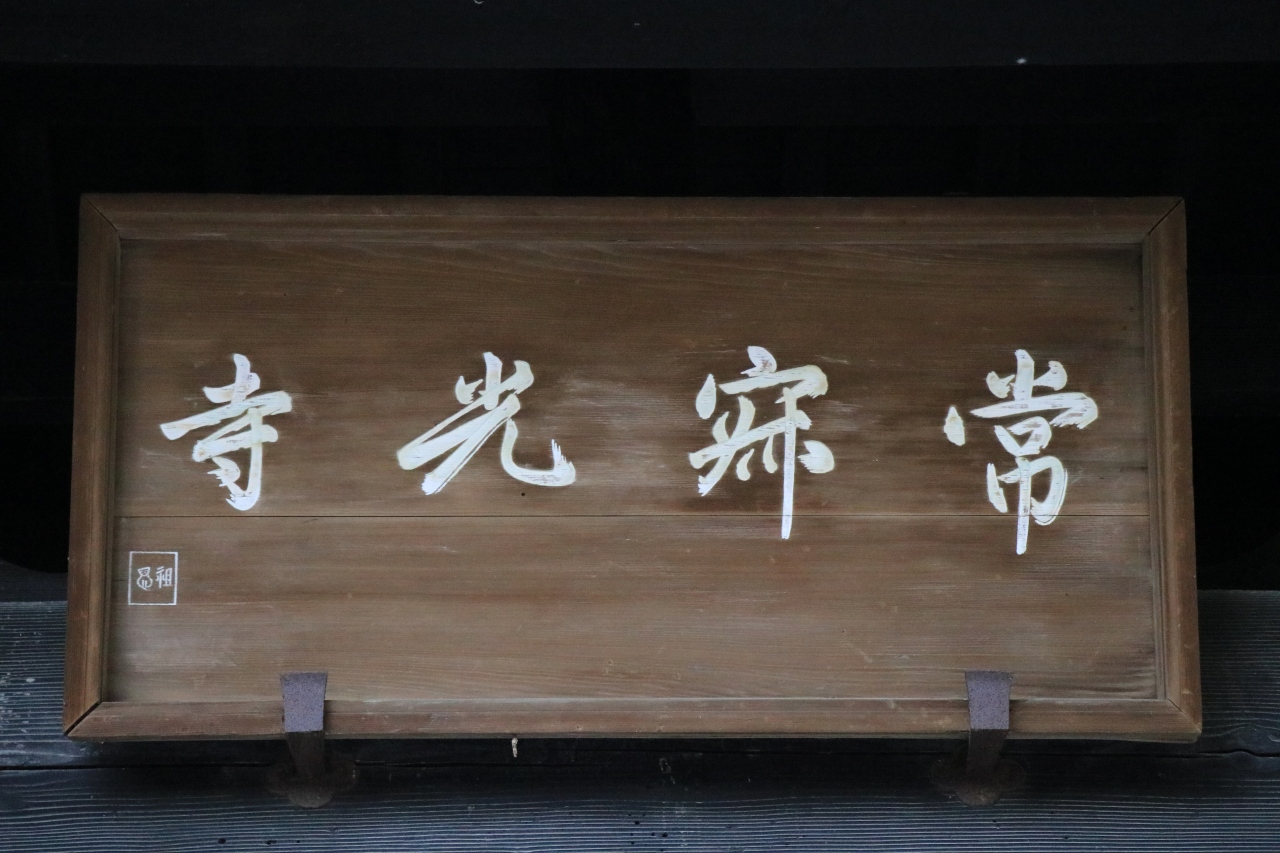 木の門と後ろで咲きほこる紅葉が良い組み合わせになります。受付は門をくぐった少し先の場所にあり、そこから見える限りずっと上り坂が続いています。門自体は小さめあっさりといった感じですが、右から書かれた「常寂光寺」という文字に歴史を感じました。