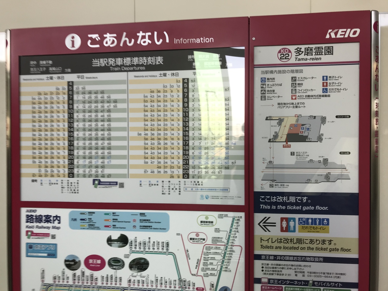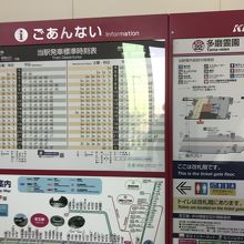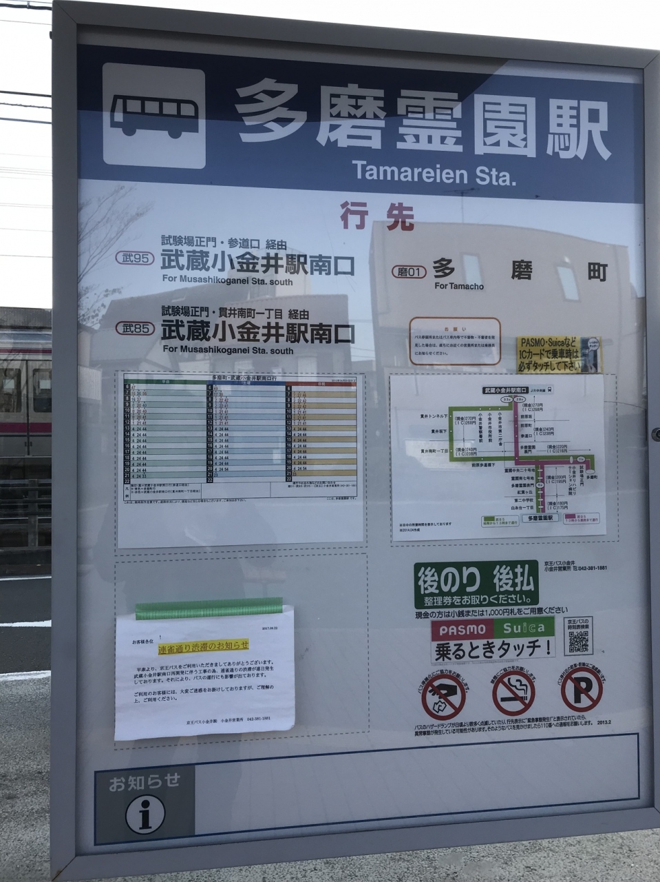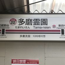 駅名になっている多磨霊園へは1.5キロ程離れたおり、バスまたはタクシーを使うのが一般的。お彼岸の時期はそれなりに混雑するが、普段の朝は府中運転免許試験場に行くバスに乗る人の方が多いかも。